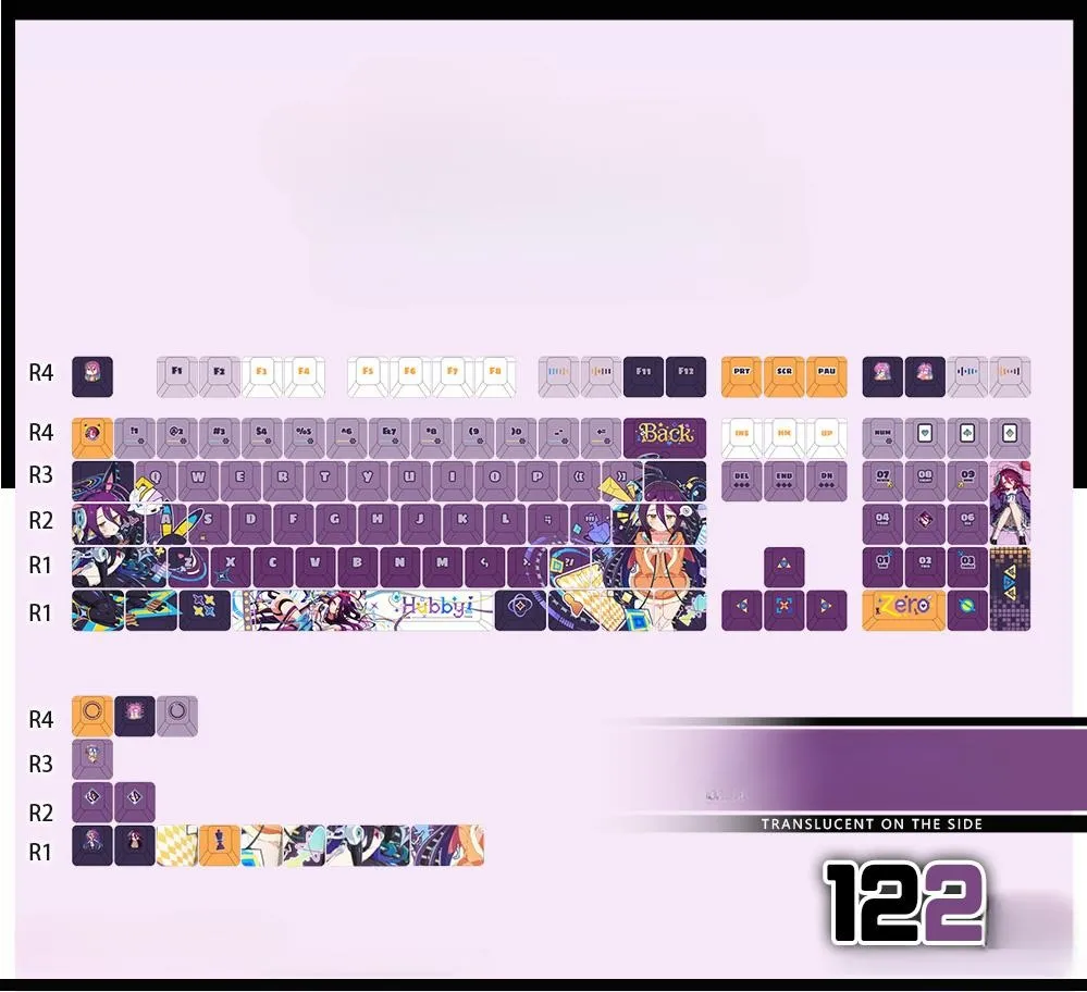 Enter the vibrant universe of NO GAME NO LIFE with our Schwi Dola Cherry Keycap Set and Mechanical Keyboard! Each of the three keycap styles in this vibrant collection—Front-Lit, Side-Lit and Opaque Versions. Which offers five distinct options. Select from keyboards with 87 or 108 keys that including Tri-Mode options or Keycap Set with 122 keys. The eye-catching mix of orange, white and purple keycaps gives your setup a whimsical touch. The ESC key has a lovely design and some keycaps feature adorable character symbols. With pride the space key shows words “Hubbyi.” This cherry-profile set is made of sturdy PBT and is ideal for both collectors and fans!