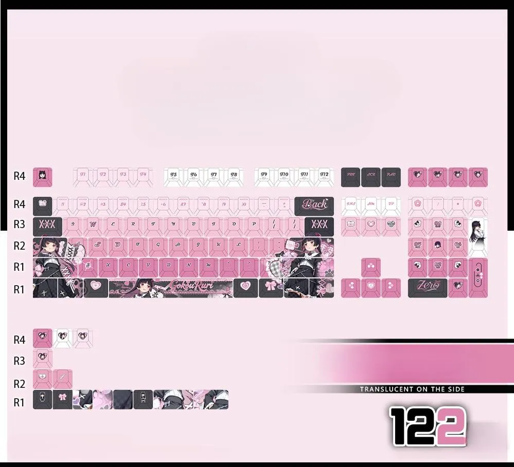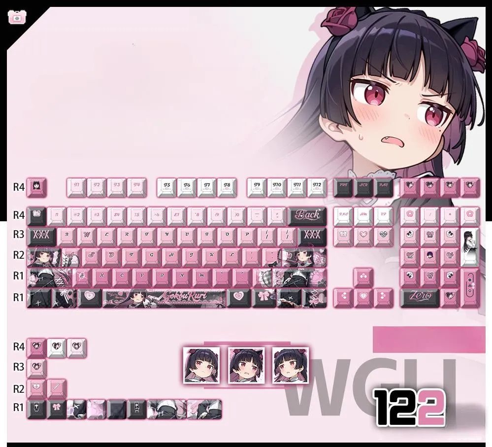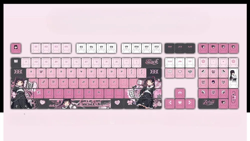 Try the captivating Oreimo: Ruri Goko OEM Keycap Set & Mechanical Keyboard to change the way you type. Select from 15 possibilities with three different keycap types: opaque, side-lit and front-lit. Five options are available for each version: a 122-key keycap set, 87-key keyboard, 108-key keyboard, tri-mode keyboard with 108 keys or 87-key keyboard. The black and white keycaps which are embellished with pink and black lettering. That design in a distinctive font style and look stunning against the pink series base. The ESC key is one example of a keycap that displays character icons and the space key displays “Ruri Goko.” Certain keycaps with heart-shaped symbols provide a charming touch. Which they are made of sturdy PBT for long-lasting quality!