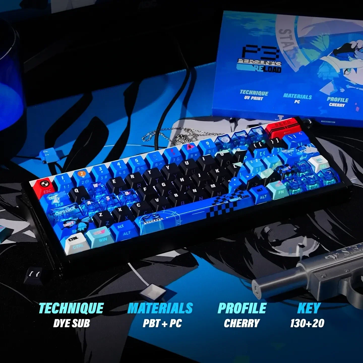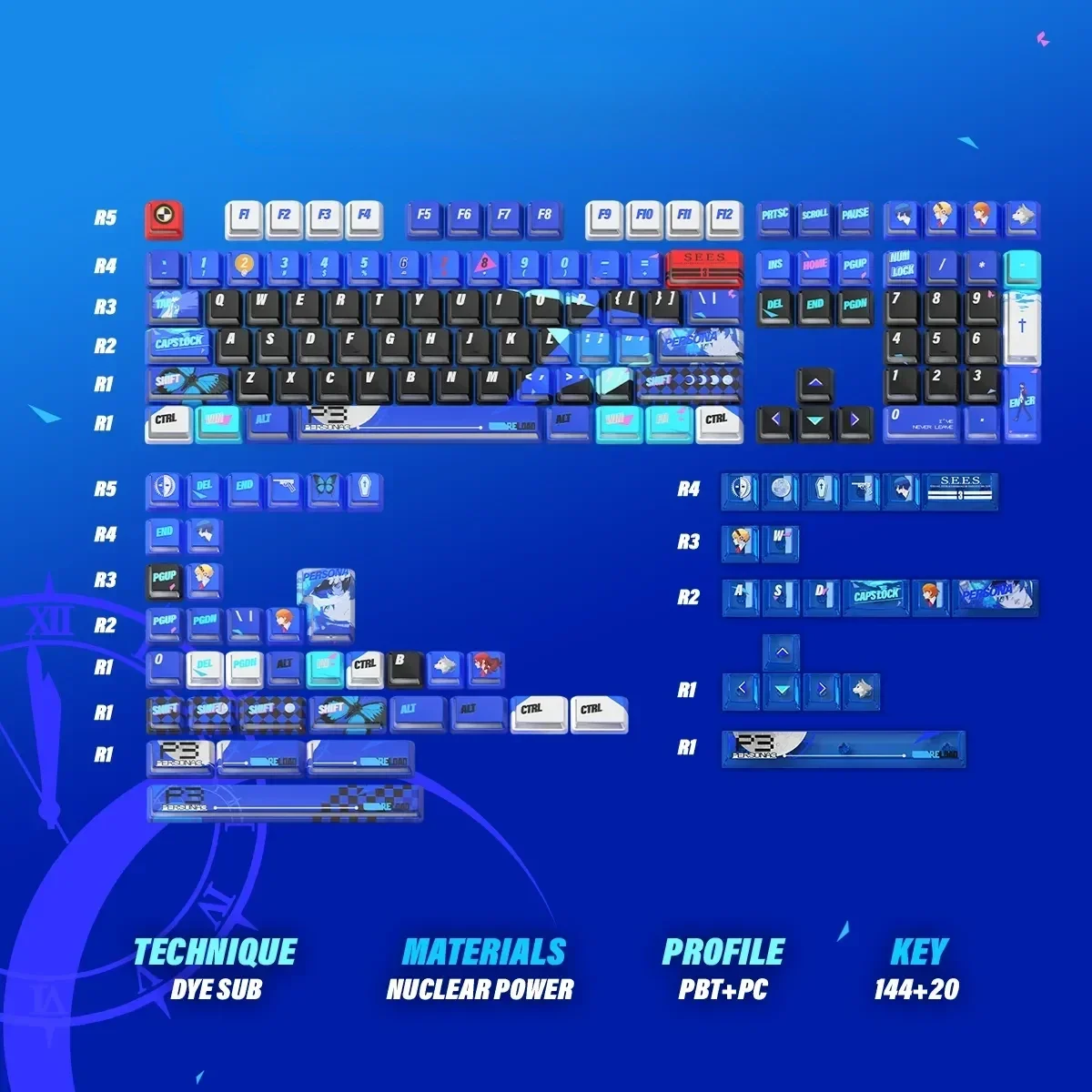 Immerse yourself in the enigmatic world of Persona 3 Reload with this premium Persona 3 Reload: Characters Series Keycap Set. Experience the high-energy essence of P3R keycaps, meticulously crafted to capture the games iconic style through a vibrant, power-infused blue aesthetic. Each keycap boasts an energetic nuclear glow and dynamic side-lit effects, transforming your keyboard into a portal to the Dark Hour. Built with durable PBT and PC material and advanced dye-sublimation, these Persona 3 Reload keycaps ensure legends that will never fade, maintaining their crisp, clear look even after countless gaming sessions. This exceptional Gaming keycap set is fully Wooting compatible keycaps, guaranteeing seamless integration and an unparalleled tactile experience. Elevate your setup with these stunning Blue keycaps and channel the electrifying spirit of P3R into every command. Unleash excitement and dominate with style.