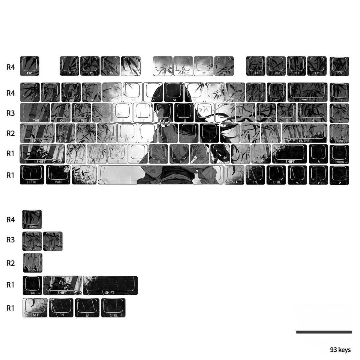Available in 93-key sets (compatible with 60/65/68/75 keyboards) and 95-key sets (compatible with 63/64/78 keyboards). Side-shine design.