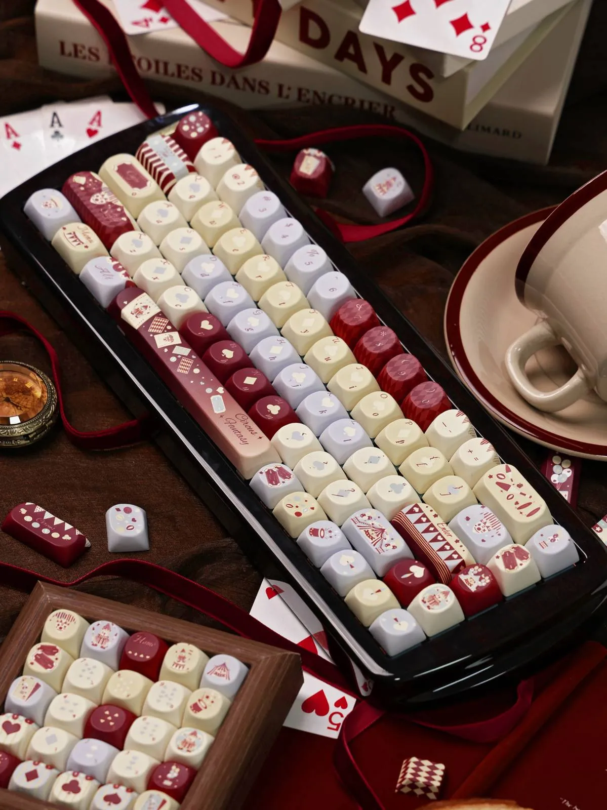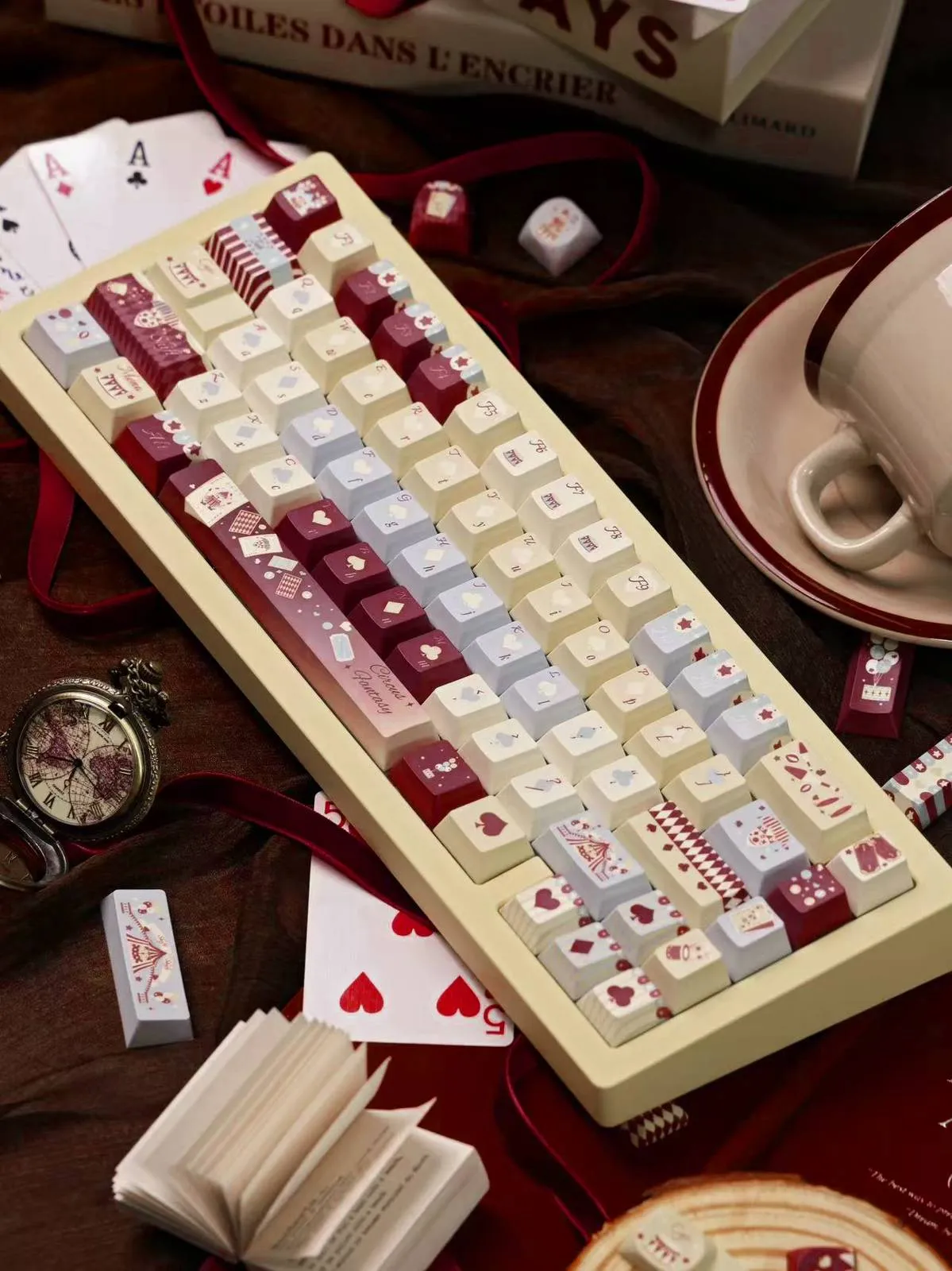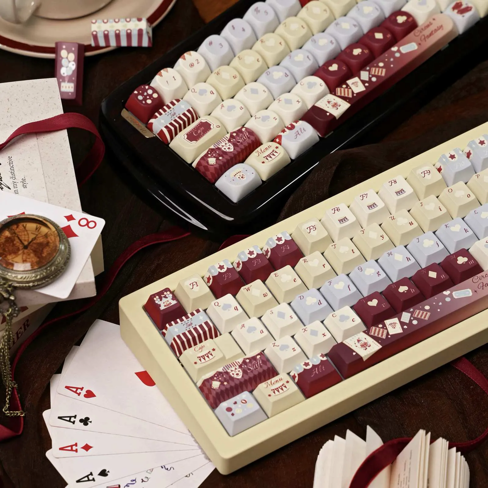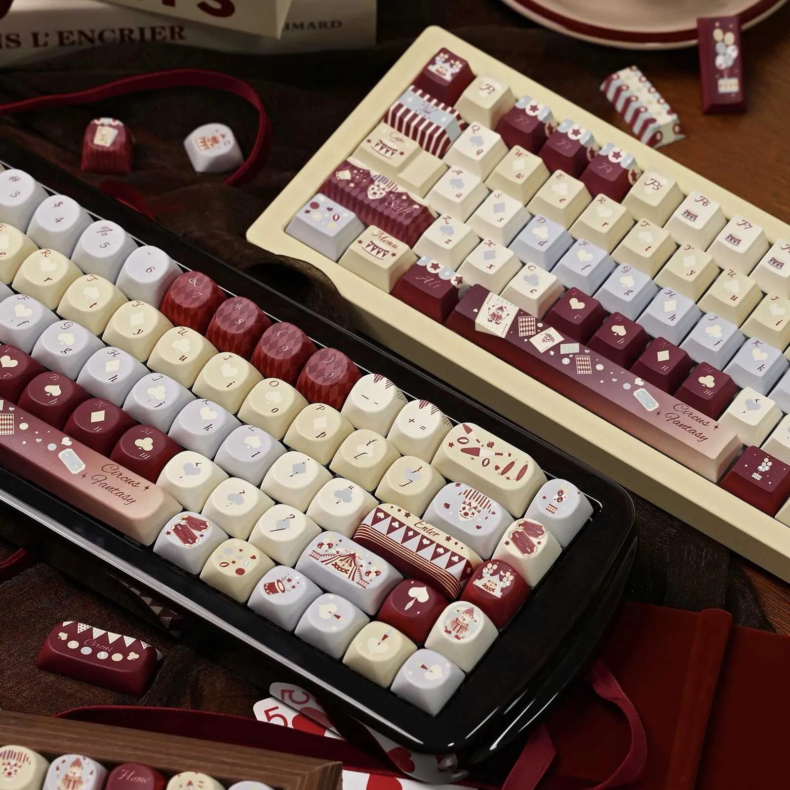 Step into a world of whimsy with the Phantom Circus Series Keycap Set! Pick from the Cherry Keycap Set and the SO Keycap Set. That both of which include a striking mix of blue, red and yellow keycaps. A humorous poker card emblem complements the Space Key’s gorgeous gradient style. The Shift Key is a fun clown design that embodies the circus vibes. With distinctive red lettering in a smaller font type gives a touch of elegance. These keycaps are made of sturdy PBT and come in Cherry and SO profiles. That guaranteeing your keyboard will look good and work well. Use this colorful assortment to enhance your typing experience!