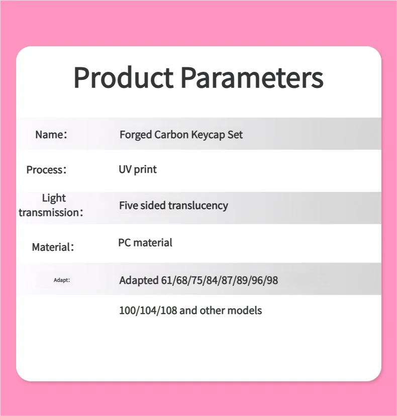 Revolutionize your keyboard’s aesthetic with our captivating Pink Forged Carbon Keycap Set. Experience the thrill of a design that masterfully fuses cutting-edge technology with vibrant, playful elegance. Each keycap boasts a distinctive Pink Forged Carbon Texture, creating a visual masterpiece that stands out. Crafted from durable PC material, these Custom PC Keycaps are designed for enthusiasts who demand both style and substance. Their Cherry Profile Keycaps ensure a comfortable and familiar typing experience, perfect for long creative sessions or intense gaming. Choose between front-engraved or sophisticated Side-Engraved Keycaps to personalize your setup further. The striking blend of high-tech forged carbon texture with a playful pink hue transforms your keyboard into a statement piece, inspiring creativity with every keystroke. Unleash your unique style and elevate your desk with this unparalleled blend of innovation and charm. Get ready to turn heads and ignite your passion.