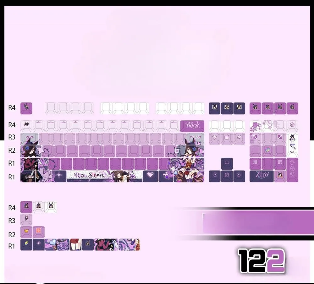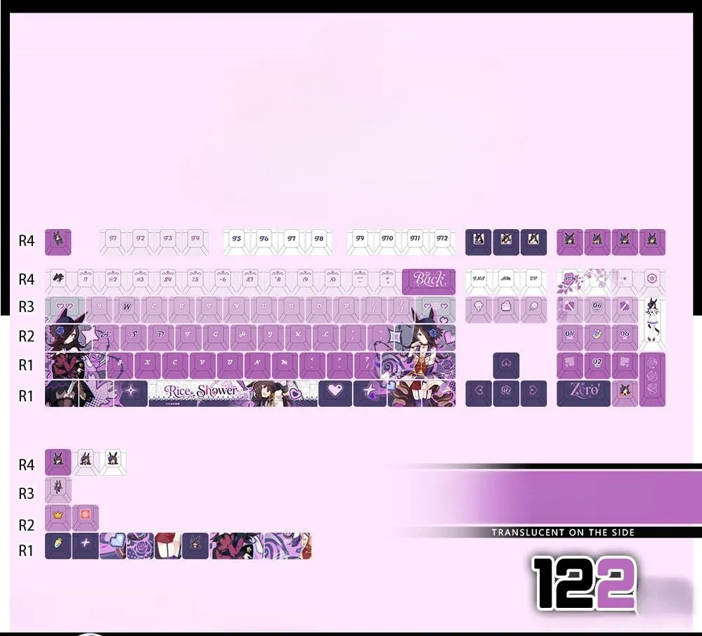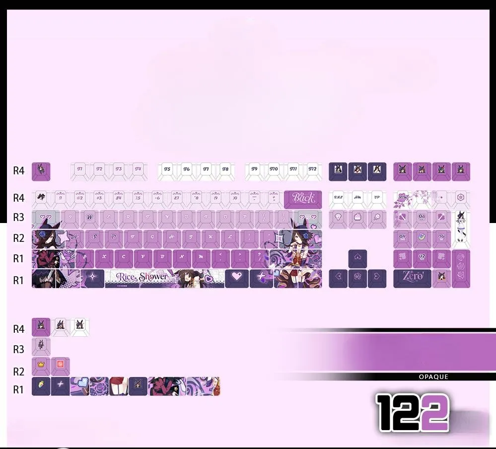 Modify the way you type with the Uma Musume Pretty Derby: Rice Shower OEM Keycap Set and Mechanical Keyboard. Select from 15 possibilities with three different keycap types: opaque, side-lit and front-lit. A keycap set with 122 keys, 87-key keyboard, 108-key keyboard, or tri-mode keyboard are the five options available for each version. The mix of white, grey and purple series keycaps produces a gorgeous look. That is accentuated by distinctive purple lettering. Character icons, such as the ESC key that are present on some keycaps. While the space key prominently displays the word “Rice Shower.” Icons in the shape of hearts add appeal and they are all made of sturdy PBT for longevity and quality!