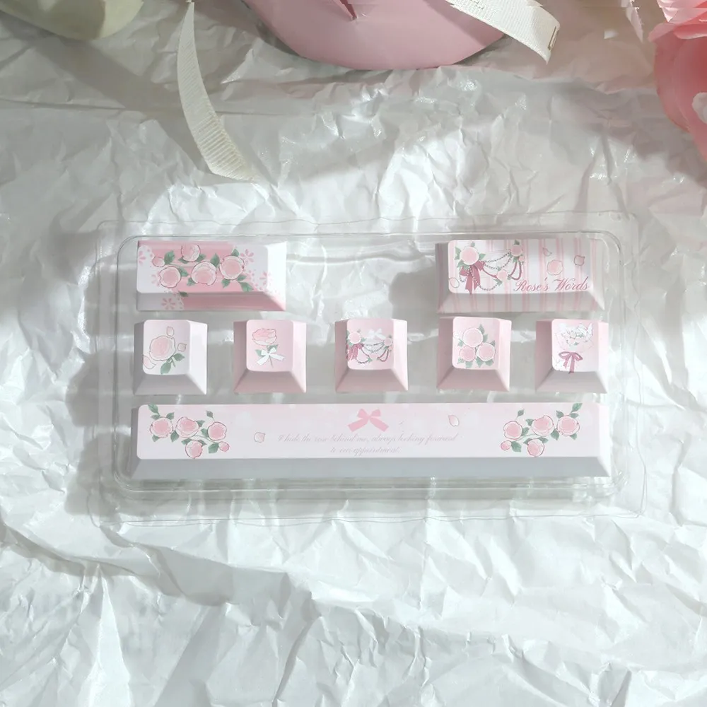 Get the Rose Manor Cherry Supplement Keycap Set to turn your keyboard into a landscape of flowers! Gorgeous pink series keycaps with lovely pink rose icon designs are part of this adorable collection. Your typing experience is made more elegant and romantic by these charming keycaps. Additionally, some keycaps feature fanciful ribbon icons which add to the overall design. Long-lasting quality and resilience are guaranteed by the set’s construction from sturdy PBT material. All typing preferences are accommodated by its comfortable Cherry profile design. This keycap set is a charming accent to any keyboard arrangement. That is ideal for enthusiasts wishing to show off their passion for all things floral!