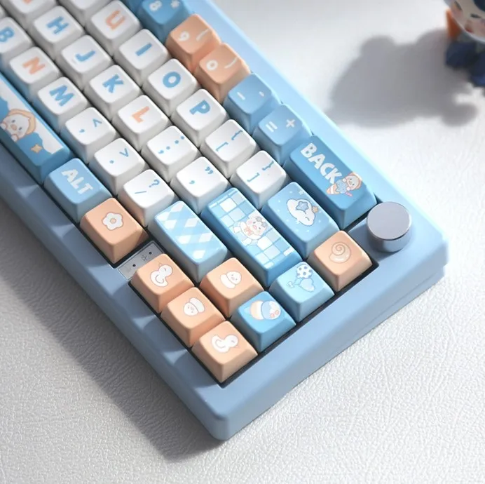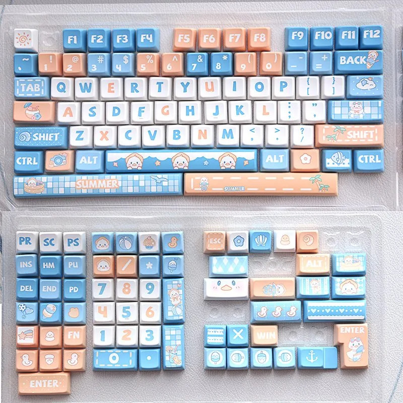 Get your keyboard back to life with the adorable Seaside Duck MDA Keycap Set! Bright orange and blue keycaps contrast with a crisp white foundation in this adorable set, giving it a whimsical look. Each keycap adds personality to your typing experience with its distinctive blue, orange and white lettering. The whimsical mood is further enhanced by the adorable duck emblems. That adorn keycaps such as the Space Key and directional keys. For those who enjoy the sea, the Shift Key proudly shows a cute shell icon. These keycaps superior feel and long-lasting quality. That are guaranteed by their construction from sturdy PBT material. Every keystroke is enjoyable because to the MDA profile’s stylish and comfortable design!