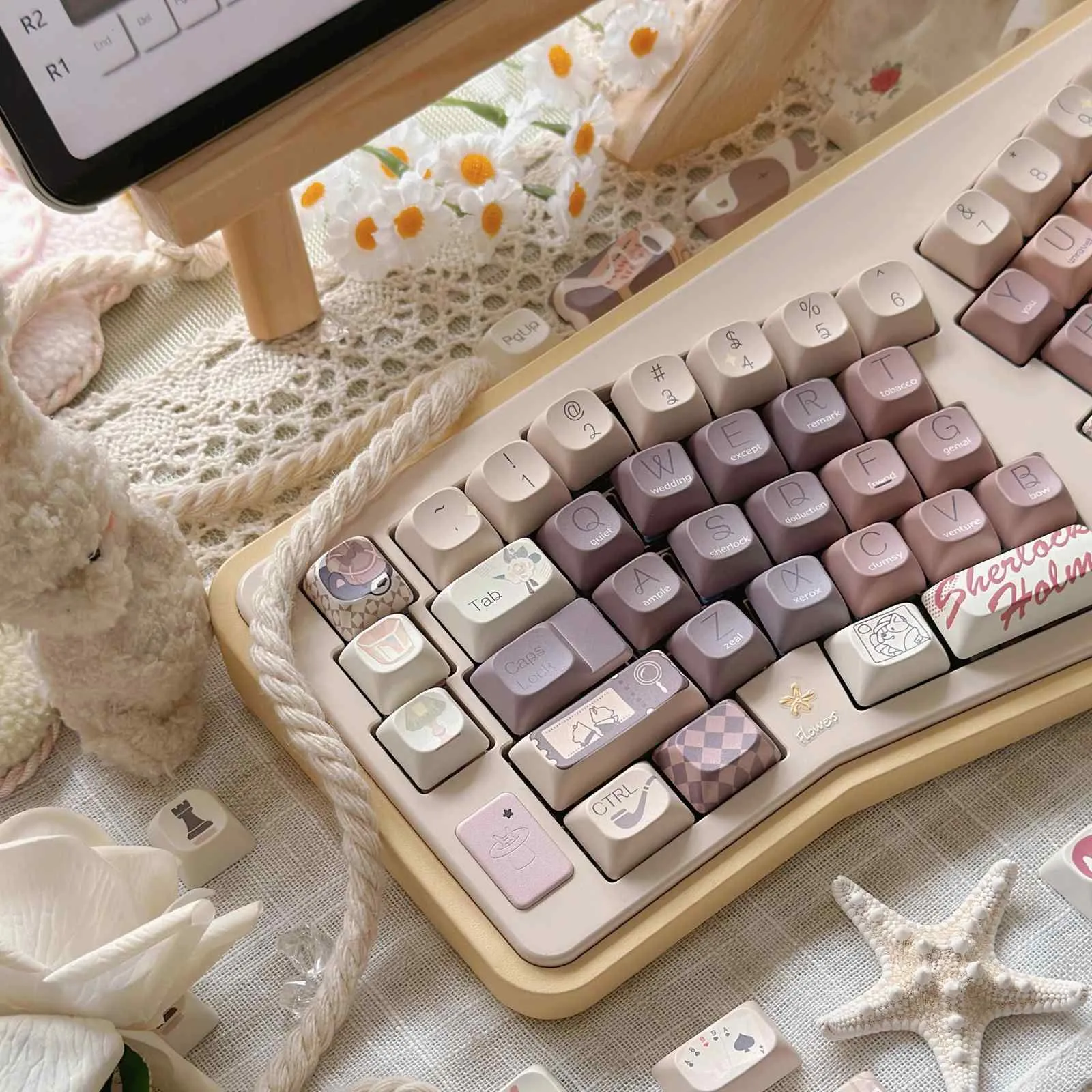 Unleash your inner detective with the captivating Sherlock Holmes Keycap Set! OEM, MDA, DMA, or MOA are the four options available to you to guarantee the perfect fit for your keyboard. The exquisite keycap color scheme of dark brown, brown, light brown, and beige in each set evokes the classic charm of Victorian London. The words “SHERLOCK HOLMES,” together with a lovely dog symbol that provides a whimsical touch, are displayed boldly on the Space Key. On the Enter and Shift Keys, a lovely puppy holding a lamp stand in for the light of discovery. Directional keys have entertaining artwork using dog signals, bones, and caps. Made of durable PBT, this keycap set easily blends fashion and functionality to enhance your typing experience.