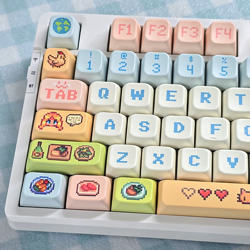 Fans of the popular game will want to have the Stardew Valley: Farming MDA Keycap Set in order to gain farming experience. This set captures the colorful style of the game with its bright blue, green, pink, purple and orange keycaps on a sleek white base. The lettering font uses orange, pink and blue colors to mimic the game’s famous look. A whimsical touch is added with distinctive character icons, food products like burgers and cute animals such as cow and hen. The Enter key displays a game controller with the phrase “PLAY” while the Esc key displays an image of Earth. This keycap set blends playful design with practicality thanks to its sturdy PBT construction!