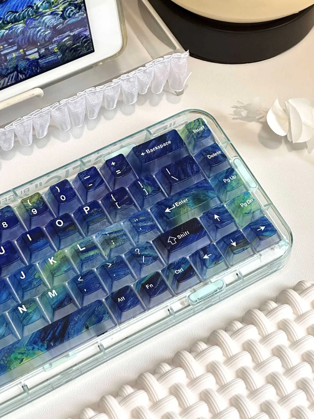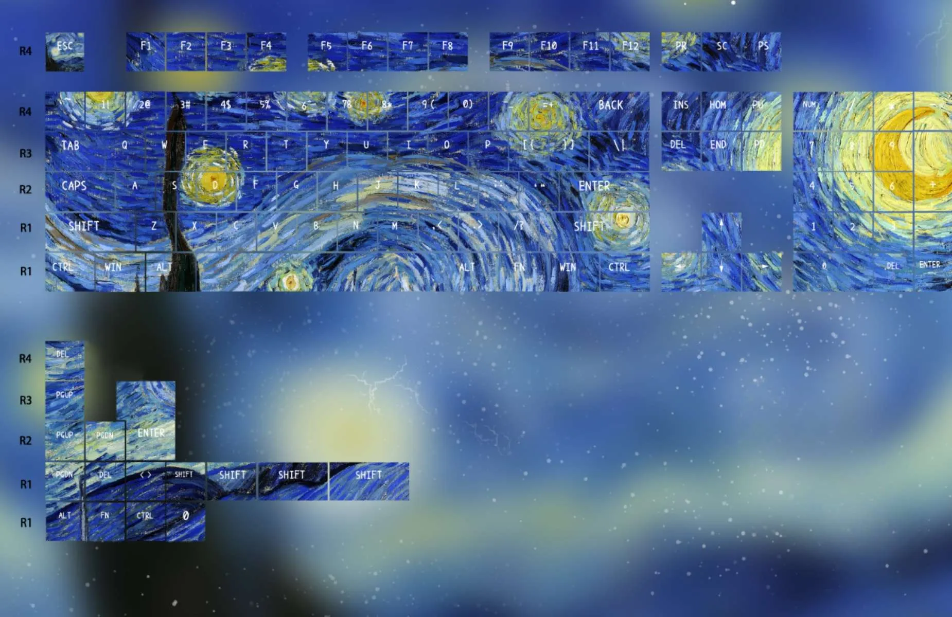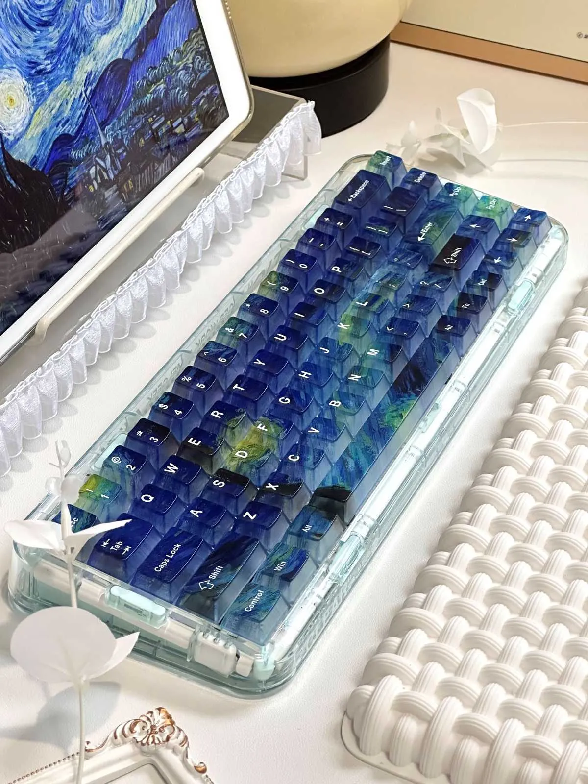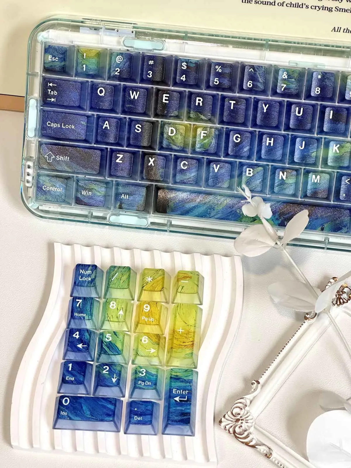 Transform your keyboard with the enchanting Starry Night Sky Cherry Keycap Set! The gorgeous blend of blue and yellow keycaps in this alluring collection. Which is evocative of the glories of a starry night sky. An exquisite paint design adorns each keycap that giving your setup a distinctive flair and creative touch. The vivid colors contrast sharply with the white text which adds flair and utility. This keycap set is made from premium PC material which is long-lasting. That has a cherry profile for maximum comfort. It enhances your workspace and turns every keystroke into an uplifting and joyful experience. That making it ideal for both art fans and keyboard fanatics!