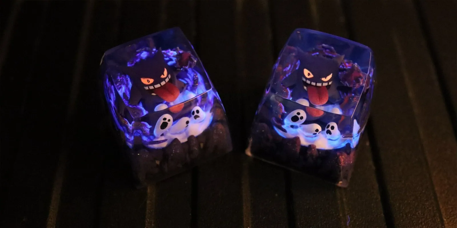Install the entertaining Pokemon: Stick Out Tongue Gengar 3.0 Transparent Keycaps to upgrade your keyboard! Choose between the traditional Gengar and its glossy version which both have the naughty appeal of it with its flaming red eyes and tongue protruding playfully. This pattern is well complemented by the vivid purple backdrop, and the stone stage base adds an intriguing element. A white ghostly apparition in front of it adds to the whole magical appearance. The engaging design produces a visually appealing 3D illusion without adding bulk. These keycaps are perfect for both fans and collectors since they turn any keyboard into a fun display of Pokemon mischief. Let joy spill out with every keystroke!