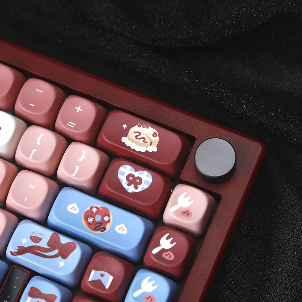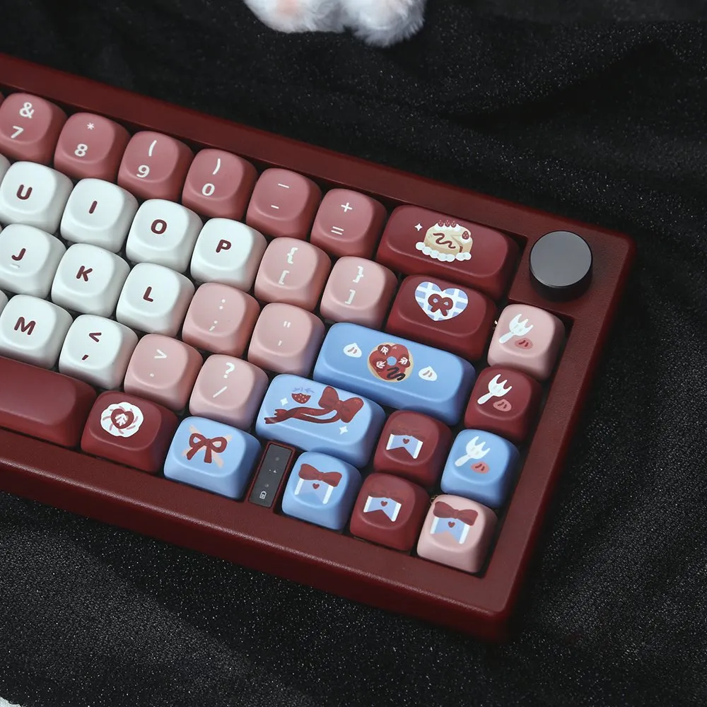 Transform your keyboard with the delightful Strawberry Fragrance MOA Keycap Set! The striking red, pink and blue keycaps on this captivating set’s white base draw attention right away. Each keycap enhances your typing experience with its distinctive font design and dark red and white writing. Notably, the lighthearted motif is further enhanced. Which is by the quirky ribbon icons on some keys such as the TAB and Shift. The Space Key’s heart-shaped emblem is ideal for showing your affection for all things sweet. A must-have for fans looking for a fruity touch. That this sturdy PBT set blends quality and design with beautiful strawberry images on select keycaps!