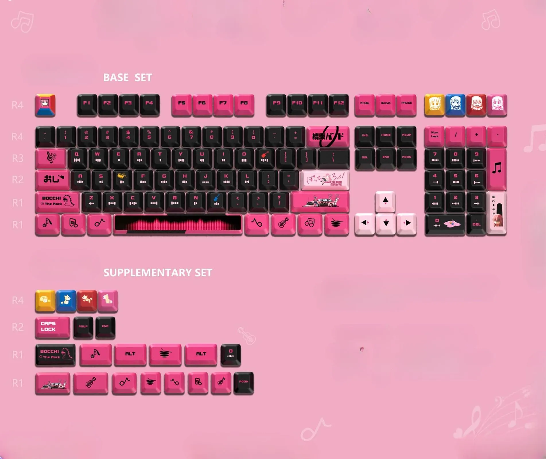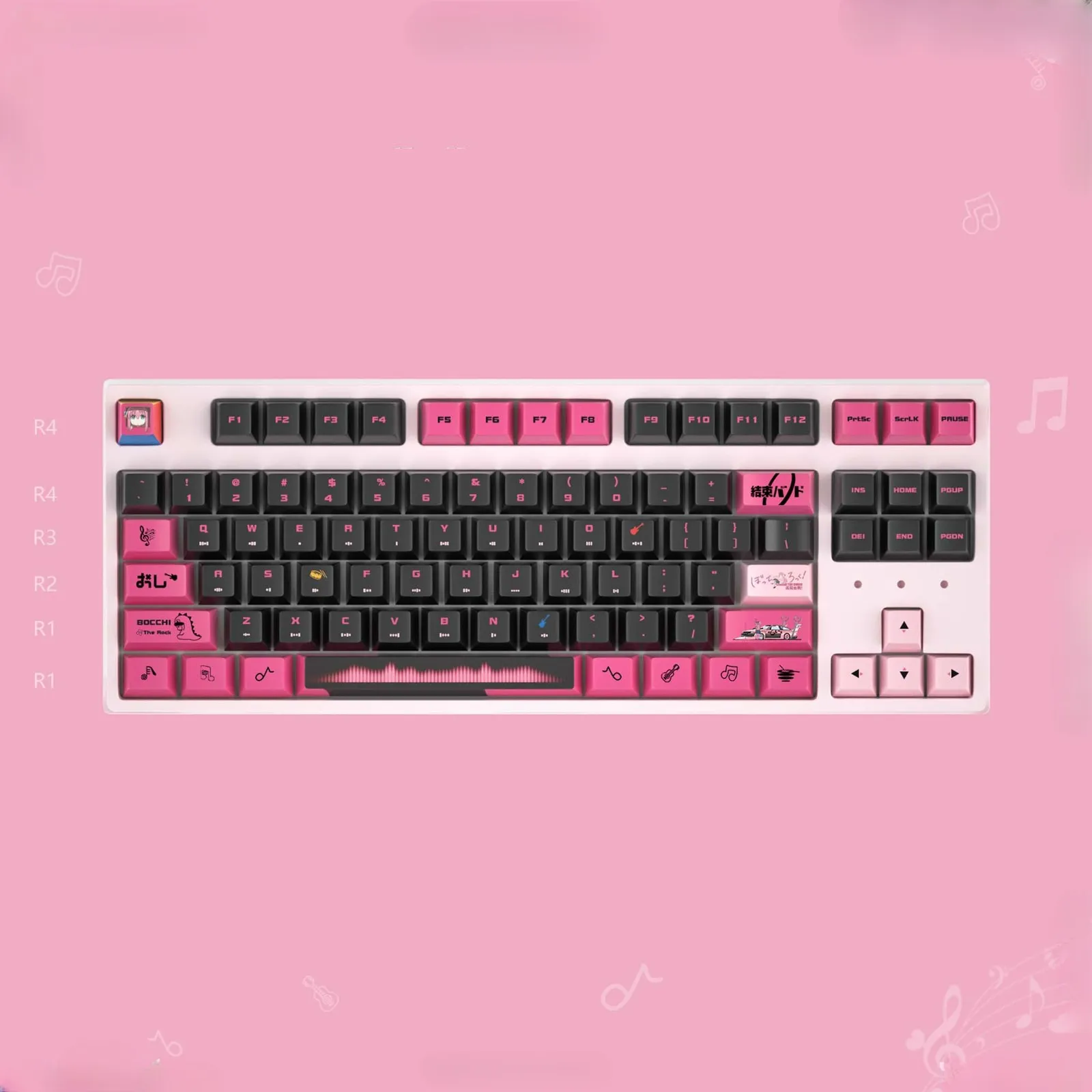 Bring musical flair to your setup with the Bocchi the Rock!: Stylish Hitori Gotoh OEM Keycap Set! This vibrant design combines anime charm with inventiveness. Soft pink and light pink keycaps look great with its sleek black base. This results in a striking yet whimsical look. Clarity is ensured keeping a fashionable appearance with pink and black letters. While some keys showcase fanciful musical note designs and some display the character emblem of Hitori Gotoh. This set is versatile enough to fit your preferences. Because it comes in two distinct options: the Opaque Keycap Set and the Light Transmission Keycap Set. It is made of sturdy PBT in an ergonomic OEM profile. Which ensures long-lasting comfort, smooth typing and artistic style influenced by anime.