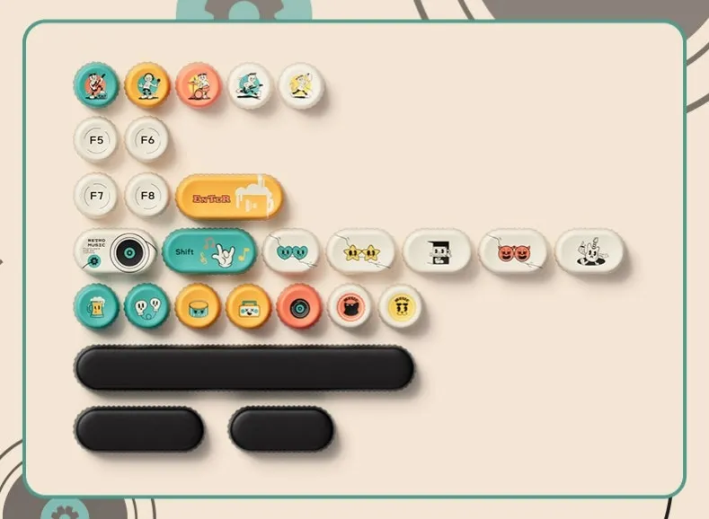 Unleash your inner rock star with the Stylish Rock Cat Keycap Set! This eye-catching collection makes a strong visual statement. Which with its sleek black base and colorful beige, green and pink keycaps. Black and pink lettering in a distinctive font design adorns each keycap. That adding flair and readability. Featuring the words “TAPE BAND” on the Enter key gives your keyboard a playful and melodic touch. Furthermore, some keycaps feature whimsical cat icon designs that add character and charm to your setup. These keycaps crafted by sturdy PBT and are designed to endure regular use without losing their vivid hues. The Rock Cat Keycap Set will enhance your workstation!