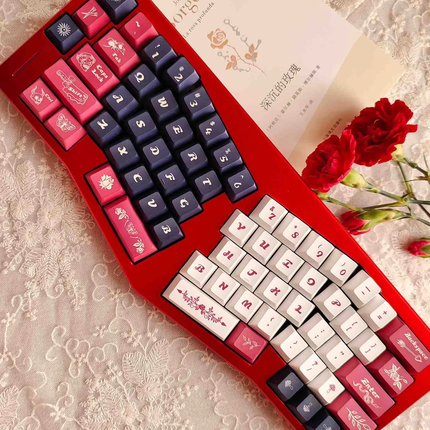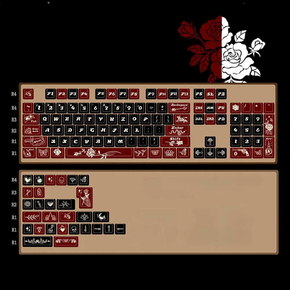 Utilize the Stylish Roses Series Keycap Set to add classic style to your keyboard! Durability, creativity and romantic flair are all combined in this adaptable collection. Select from the elegant White Rose design which has a pure white base, red highlights that with lovely dual-tone text. While the striking Dark Rose design which has a sleek black base with vivid red keycaps and sharp white lettering. Some keys are decorated with delicate rose designs. While a pistol emblem gives them a bold twist on one of the keycap. These keycaps are made from high-quality PBT and come in OEM or QX3 profiles. As well as bundle choices for further versatility. An ideal option for striking individualism, comfort and style.