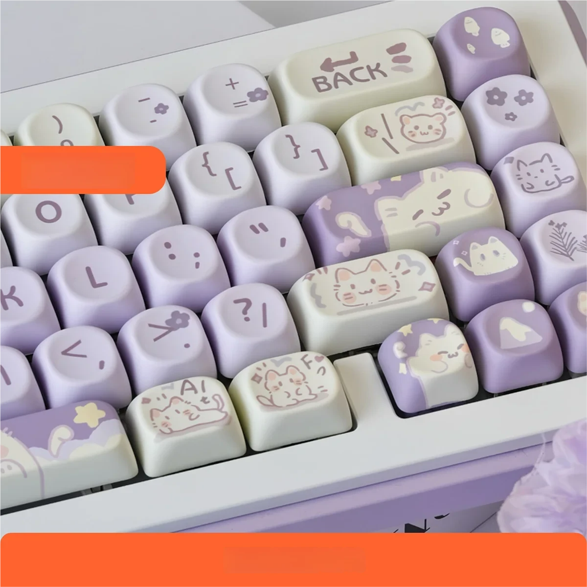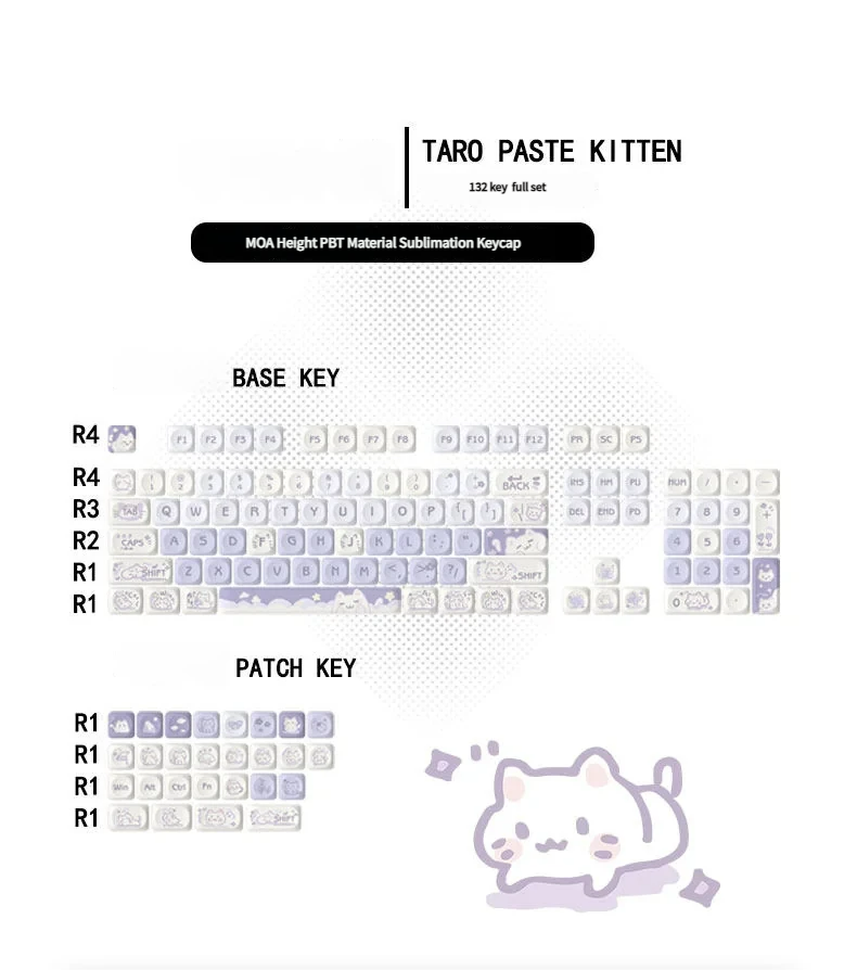 Unleash a wave of delightful charm onto your workspace with our Taro Paste Kitten MOA Keycap Set! This adorable PBT dye-sub MOA keycap set is designed to transform your keyboard into a canvas of pure joy. Featuring whimsical kittens frolicking amidst soft pastel purple and white taro paste hues, these keycaps are a treat for both the eyes and fingertips. Crafted with durable PBT material and utilizing a vibrant dye-sublimation process, each keycap offers lasting color and a smooth, comfortable feel. The unique MOA profile set provides an ergonomic typing experience, making every keystroke a pleasure. Perfect for anyone seeking a cute keyboard aesthetic, these Taro Kitten Keycaps infuse personality and playful elegance into your setup. Elevate your daily typing with a touch of joyful whimsy and let these charming kittens inspire your creativity.