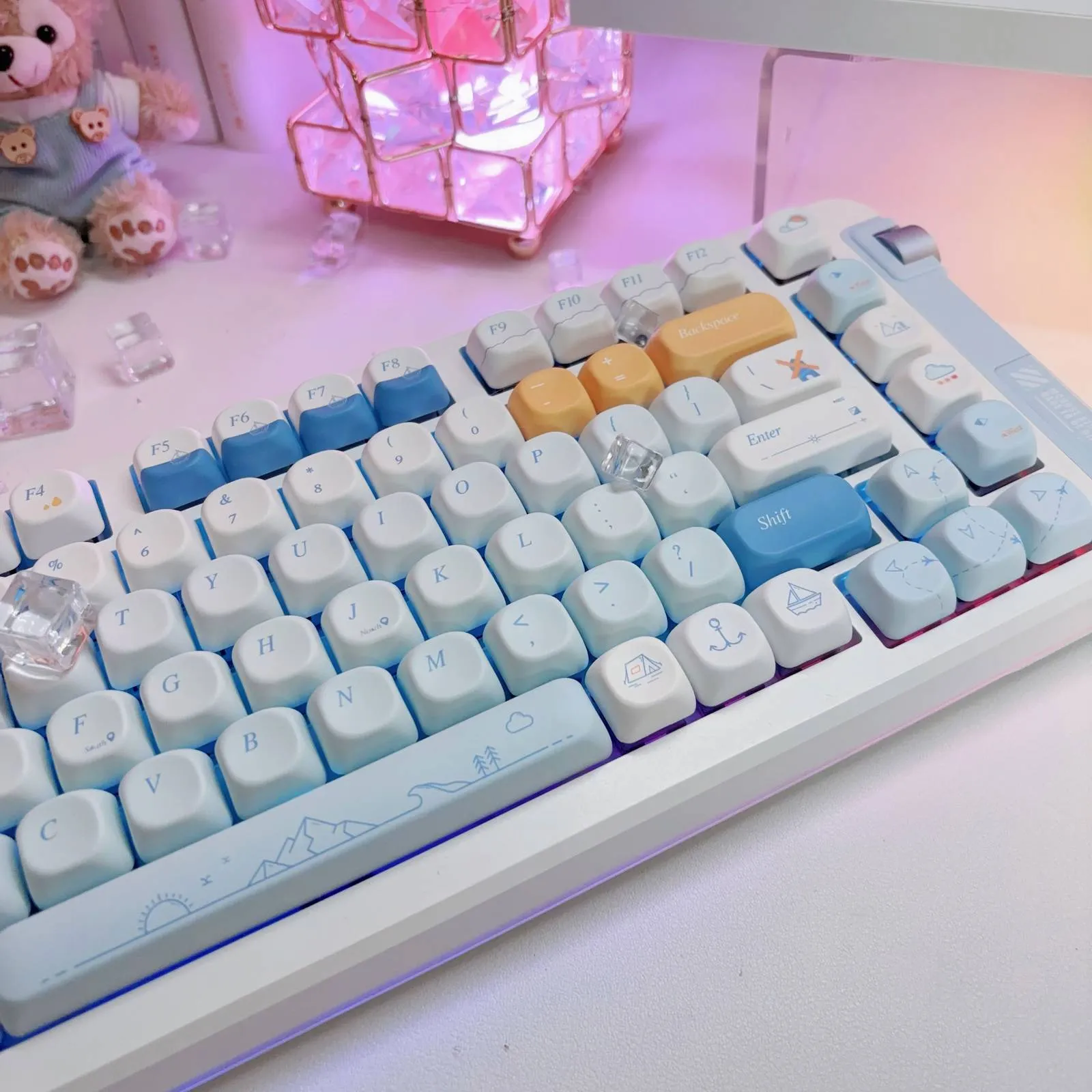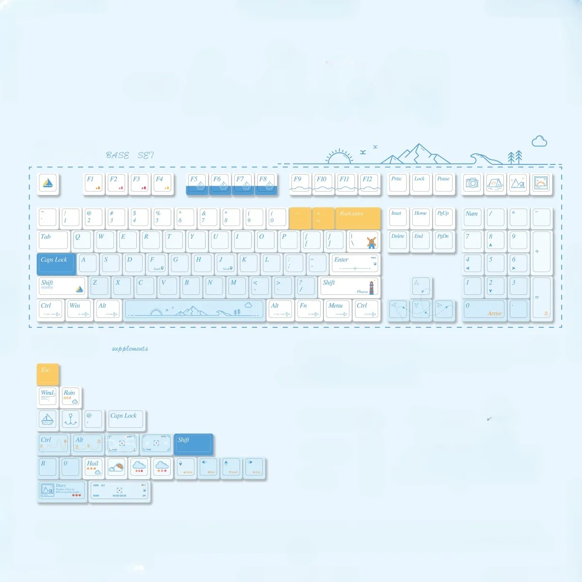 Bring typing to the next level with the Travel Together Series Keycap Set! The OEM with Supplement Keycap Set and the QX3 with Supplement Keycap Set are your options. This gorgeous set has a remarkable visual contrast with its blue series base and white keycaps. Each keycap adds a personal touch to your keyboard with its distinctive font style and blue lettering. Interestingly, the ESC Key has an adventurous ship icon. While the Space Key displays a mountain and sun icon. This keycap set which is made of sturdy PBT material. That is the ideal option for any keyboard fan because it blends style with utility!