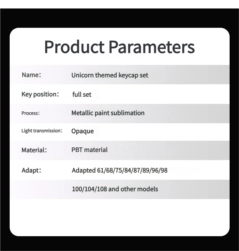 Embark on an enchanted journey with our Shimmering Pearlescent Unicorn Keycap Set, a tribute to vibrant fantasy and unique, artistic style. These premium PBT keycaps transform your mechanical keyboard into a canvas of iridescent wonder, capturing the magical essence of a unicorn with every shimmering hue. Crafted using advanced dye-sublimation, the vibrant legends on these Pearlescent PBT Keycaps are designed for exceptional durability and visual brilliance, ensuring your mystical aesthetic remains captivating through countless gaming sessions. Perfect for both dedicated gamers and enthusiasts seeking unparalleled personalization, these Unicorn Keycaps are engineered for an immersive experience. Elevate your setup with a touch of enchantment, turning every keystroke into a magical moment. Designed with compatibility in mind, these magnificent keycaps are also ideal as Magnetic Switch Keycaps, ensuring seamless performance and a truly responsive feel. Unleash the vibrant fantasy within your fingertips.