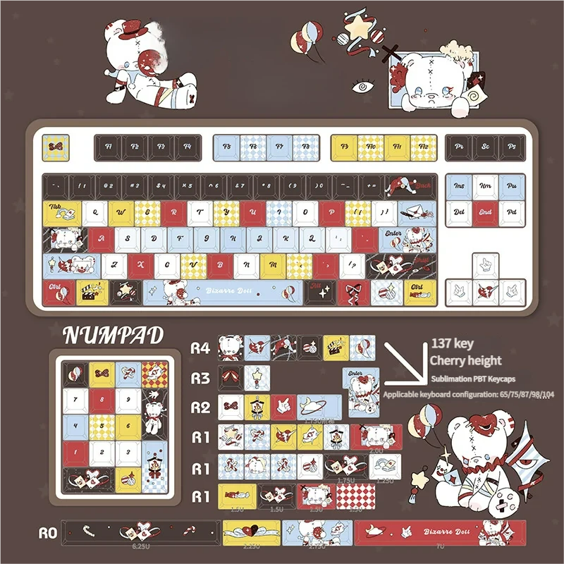 Unleash a wave of whimsy and delightful eccentricity onto your mechanical keyboard with our Wacky Doll Cherry Keycap Set. Each Unique Artisan Keycap is a miniature masterpiece, designed to infuse your setup with quirky charm and unparalleled personality. Crafted from high-quality PBT material, this PBT Dye-sub Keycap boasts exceptional durability and vibrant, fade-resistant graphics. Which ensuring your eccentric companion remains captivating for years to come. The Wacky Doll Keycap features a playful, slightly macabre aesthetic, showcasing cute novelty characters that are sure to spark conversation and creativity. Engineered with an ergonomic Cherry Profile Keycap height, it offers a comfortable and familiar typing experience. Elevate your creative space and let your fingers dance with delightful eccentricity, one Wacky Doll at a time.