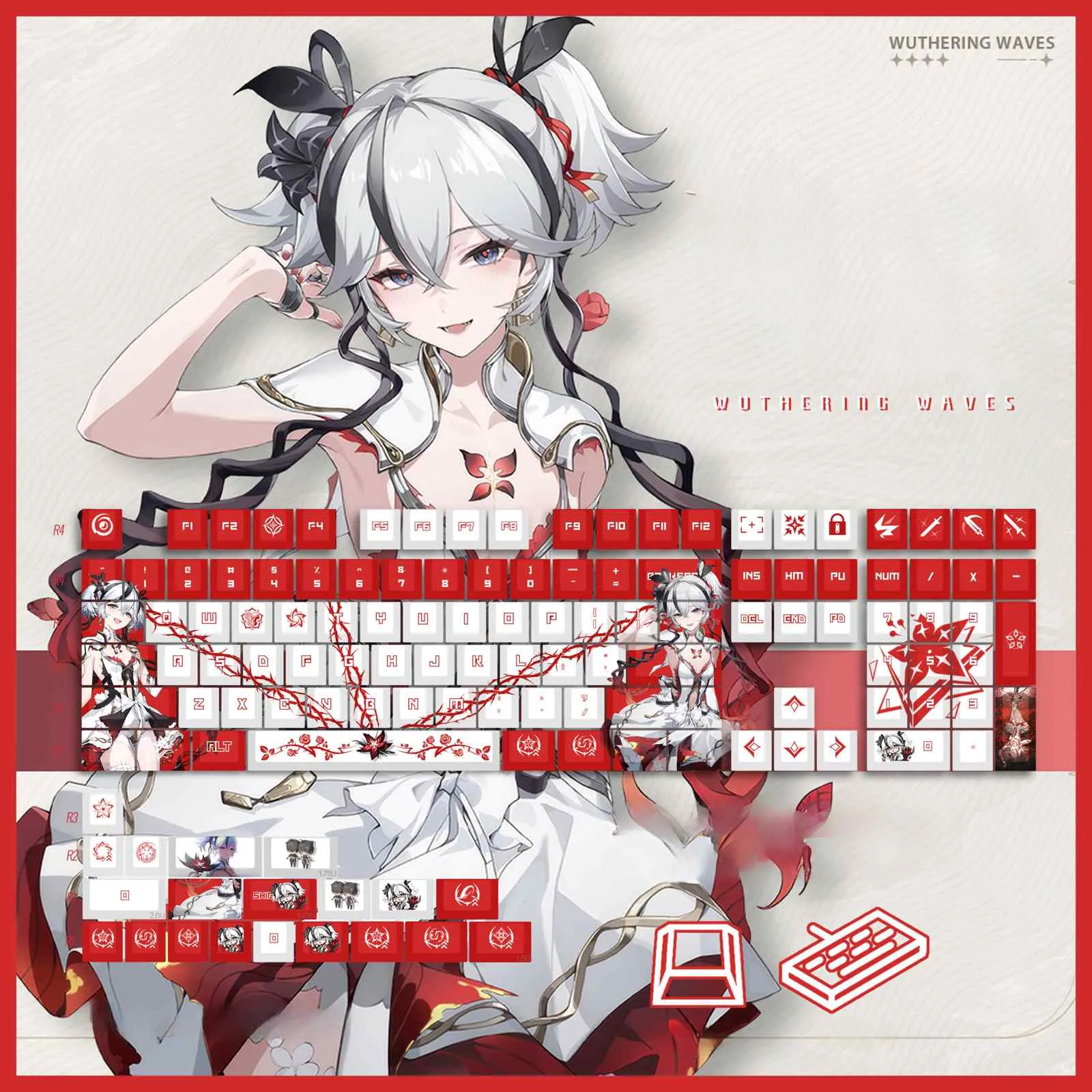 Enhance your setup with the Wuthering Waves: Camellya Keycap Set & Mechanical Keyboard! The Camellya Keycap Set, wired or wireless keyboard versions. Which keyboard version was with Red, Brown, Blue or Black are among the nine alternatives available. This gorgeous keyboard has a sleek white base and bright red keycaps that contrast sharply. The Space Key features a lovely floral emblem. That the distinctive red and white lettering gives a fashionable touch. Its attractiveness is increased by the character symbols that adorn keys like Enter and Backspace. This keycap set crafted by sturdy PBT material which guarantees comfort and longevity. It is an essential item for every keyboard aficionado!